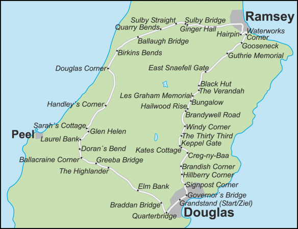 Die Rennen der TT finden nicht auf einem speziellen Rundkurs statt, sondern auf den normalen Straßen der Insel. Diese werden während des Trainings und des Rennens für den normalen Verkehr gesperrt. Start und Ziel ist in Douglas, der Inselhauptstadt. Die 60,72 km lange Strecke, der so genannte Mountain Course, stellt wie kein anderes Rennen Anforderungen an Mensch und Material.