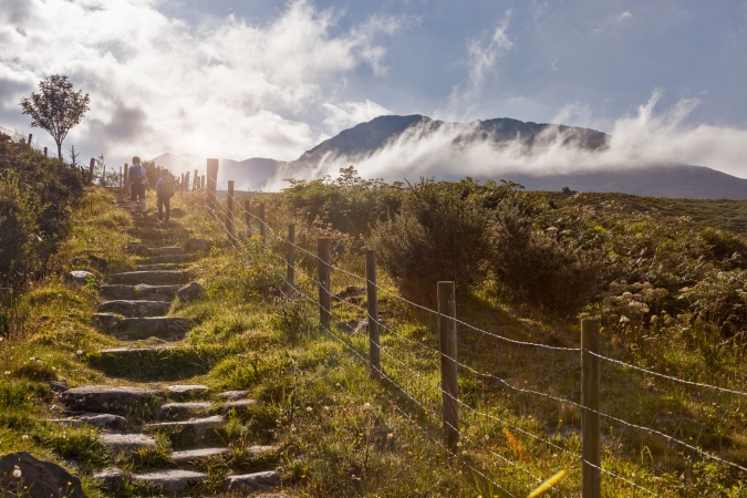 Nördlich von Kenmare führt der Weg Sie in den Killarney National Park mit seinen majestätischen Seen mittendrin. Zwischen dem Muckross Lake und dem Lough Leane liegt das prächtige viktorianische Muckross Herrenhaus. Von hier aus führt der Weg vorbei an Feldern mit grasendem Weidevieh. Der Torc Berg ist eine der Optionen für die heutige Wanderung. Sie durchwandern ein Waldstück, bevor üppige, grüne Weiden Sie zum Ufer des Sees führen zu Brandon’s Cottage, einer einfachen Jagdhütte aus dem 19. Jahrhundert, von wo aus Schiffe über den Upper Lake abfahren. Leichte Wanderung: 11 km / Aufstieg 300m. Anspruchsvollere Wanderung: 14,5 km / Aufstieg 600m.